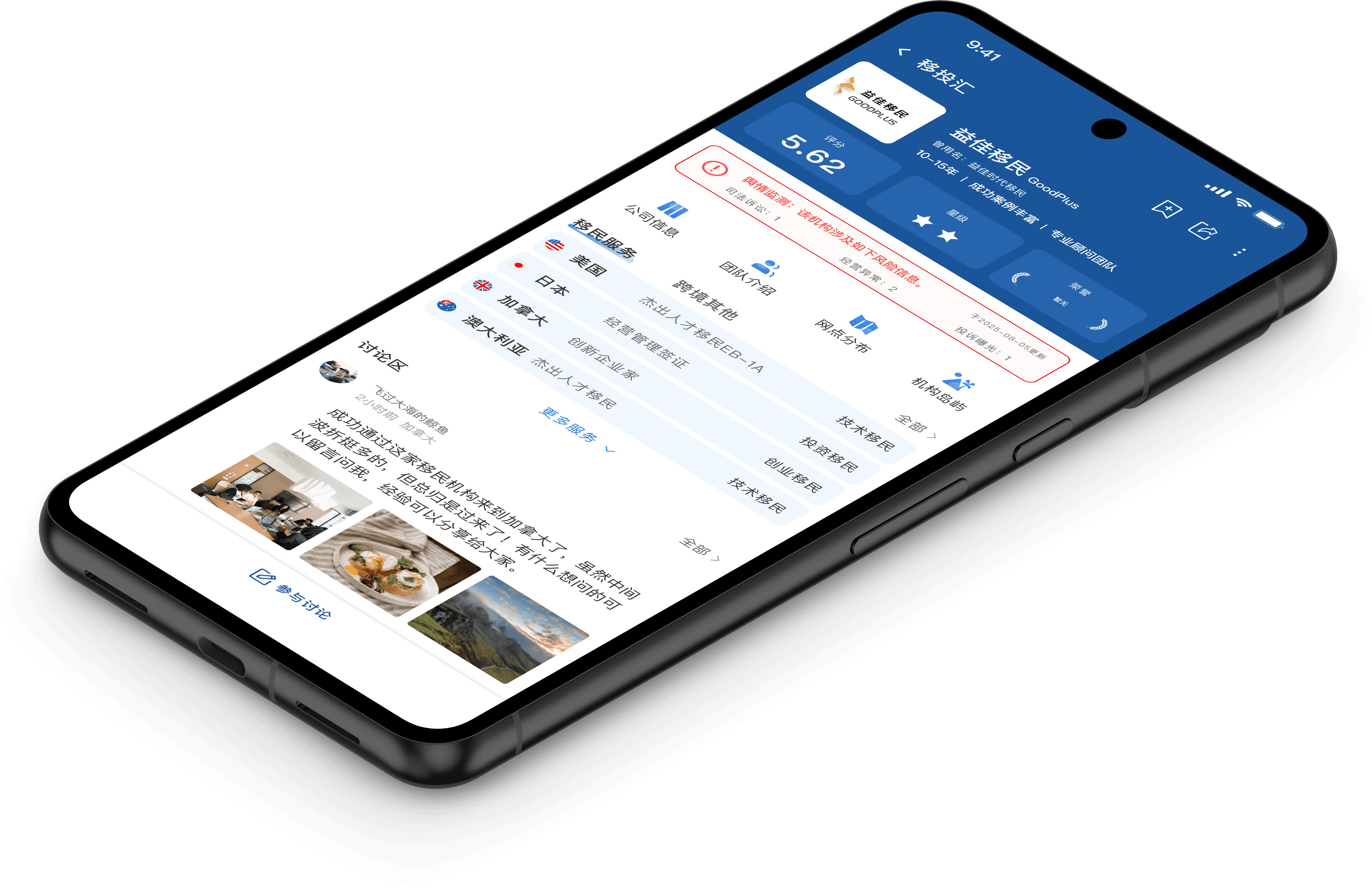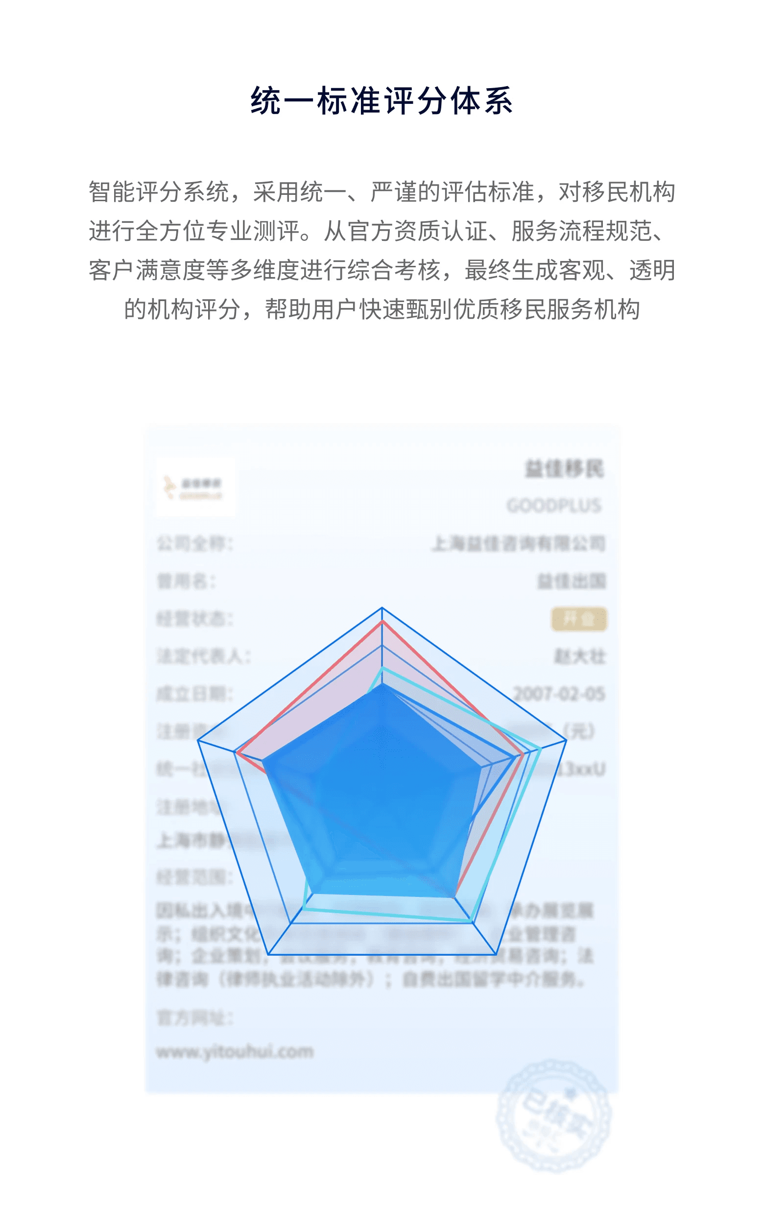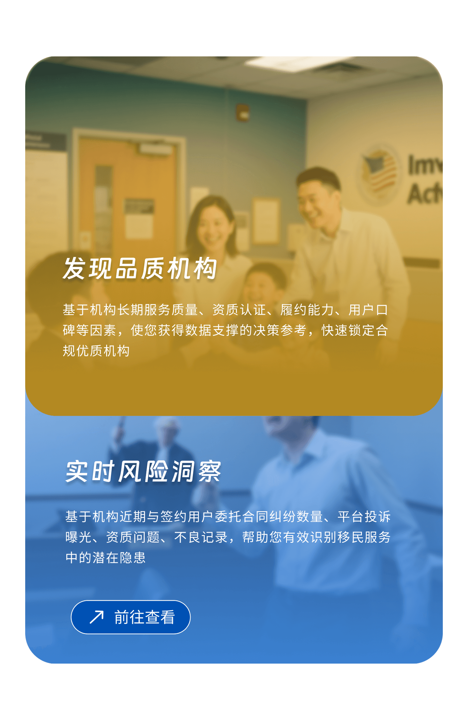 平台基于智能评分系统,采用统一、严谨的评估标准,对移民机构进行全方位专业测评。系统从资质认证、服务流程规范、客户满意度等多维度进行综合考核,最终生成客观、透明的机构评分,帮助用户快速甄别优质移民服务机构