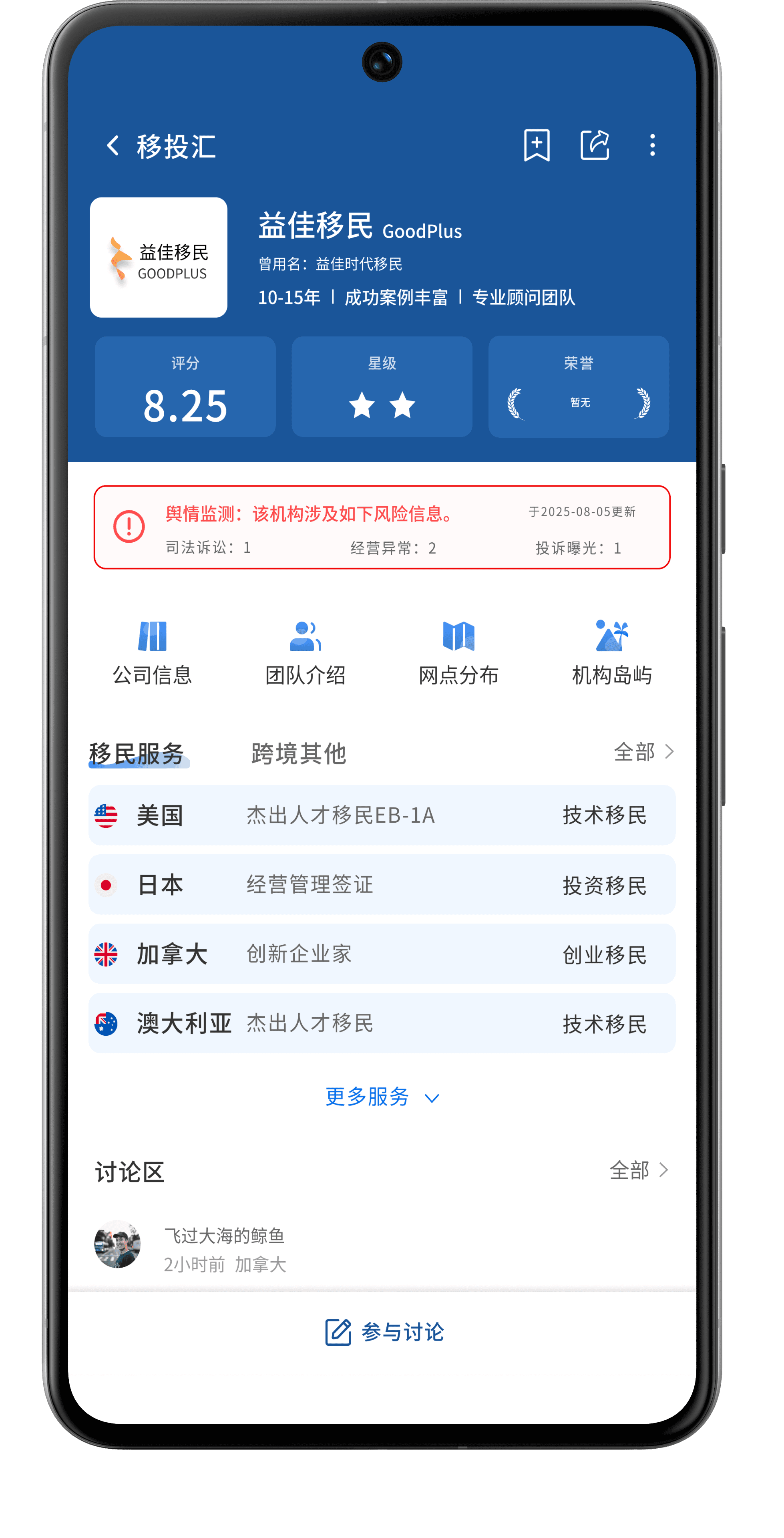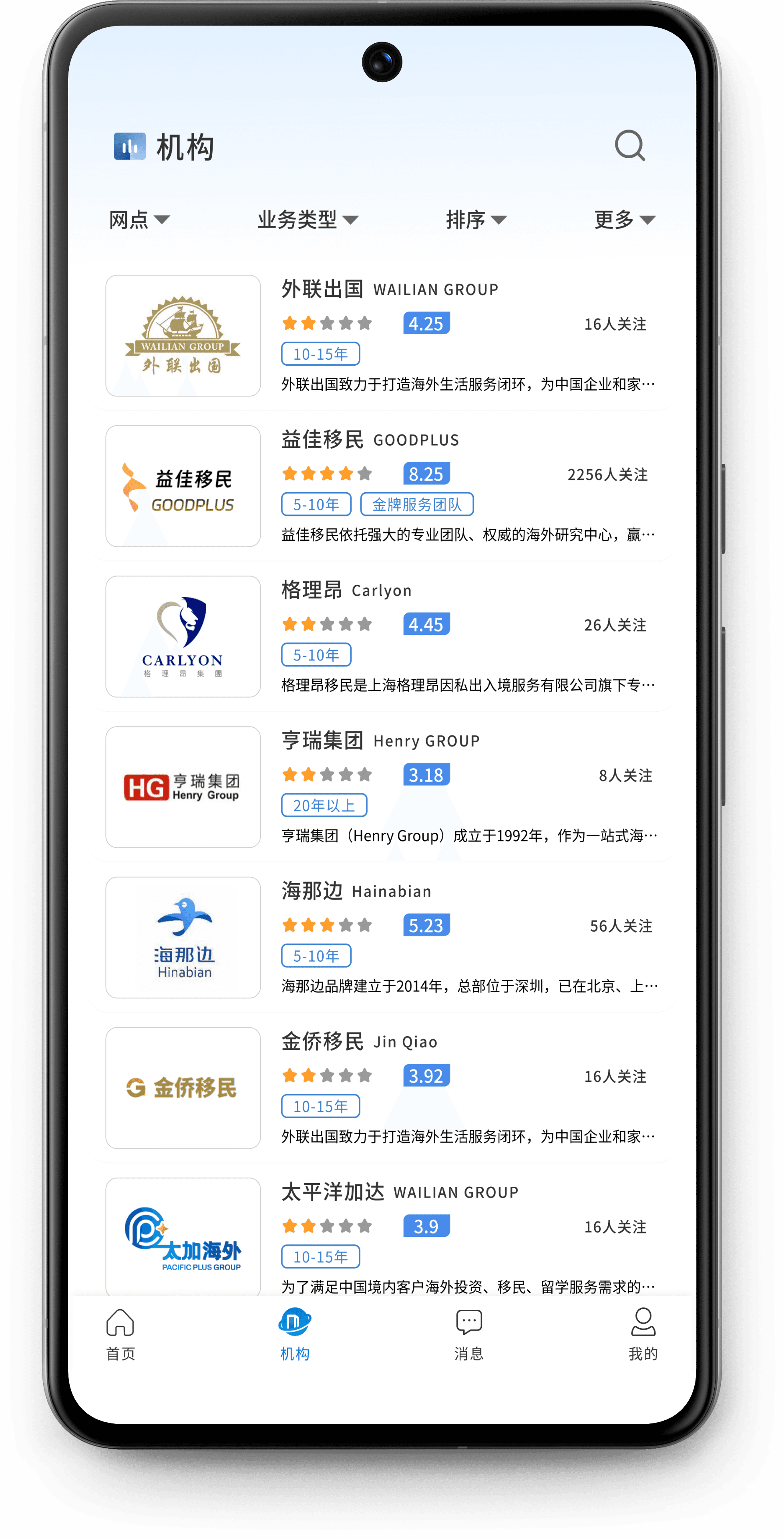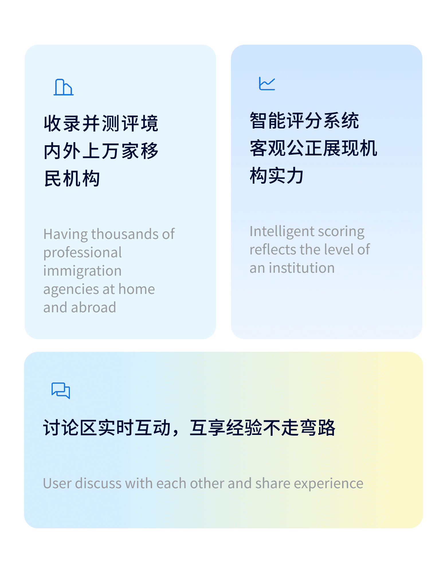 平台基于智能评分系统,采用统一、严谨的评估标准,对移民机构进行全方位专业测评。系统从资质认证、服务流程规范、客户满意度等多维度进行综合考核,最终生成客观、透明的机构评分,帮助用户快速甄别优质移民服务机构