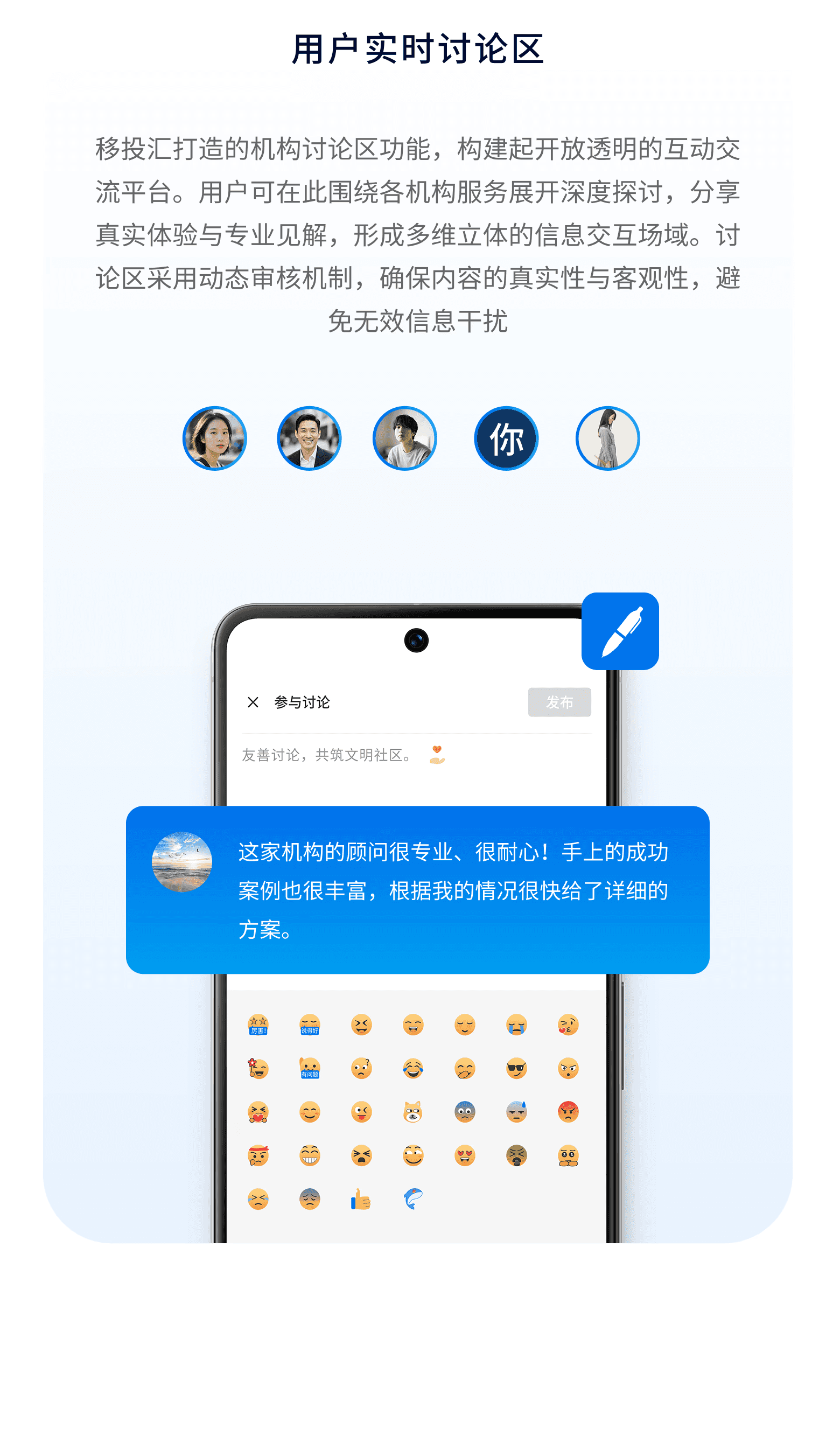 移投汇构建起开放透明的互动交流平台,用户可在此围绕各机构服务展开深度探讨,分享真实体验与专业见解,形成多维立体的信息交互场域。讨论区采用动态审核机制,确保内容的真实性与客观性,避免无效信息以及广告干扰